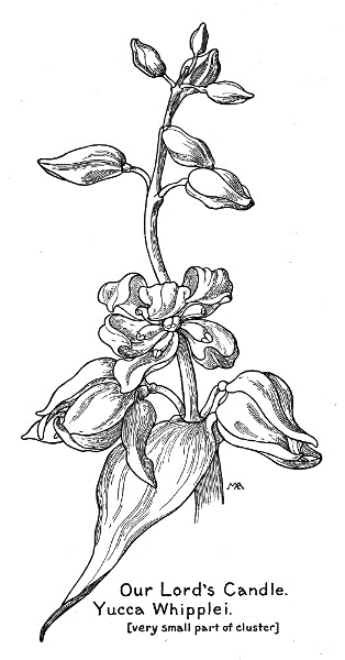 A noble plant, with no trunk, but sending up a magnificent shaft of flowers, from five to fifteen feet tall, springing from a huge, symmetrical bunch of dagger-like, bluish-green leaves. The cluster is composed of hundreds of waxy, cream-colored blossoms, sometimes tinged with purple, two inches across, crowded so closely together along the upper part of the stalk that the effect is a great, solid mass of bloom, three feet long. The white filaments are swollen, tipped with pale-yellow anthers; the pistil cream-color, with green stigmas. The large, white bracts are stiff and coarse, something like parchment, folded back so that the pinkish stalk is ornamented with a series of white triangles, symmetrically arranged. A hillside covered with hundreds of these magnificent spires of bloom, towering above the chaparral, is a wonderful sight. After they have blossomed, the tall, white stalks remain standing for some time, so that the hills look as if they had been planted with numbers of white wands.