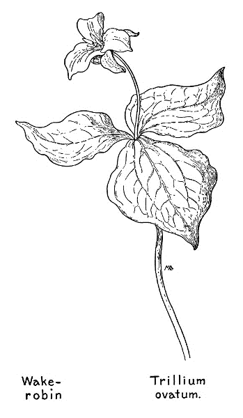 A charming plant, about a foot tall, with a single beautiful blossom, set off to perfection by its large, rich green leaves. The flower is two or three inches across, with lovely white petals, which gradually change to deep pink. It is a pleasure to find a company of these attractive plants in the heart of the forest, where their pure blossoms gleam in the cool shade along some mountain brook. They resemble the eastern Large-flowered Trillium and grow in the Coast Ranges.