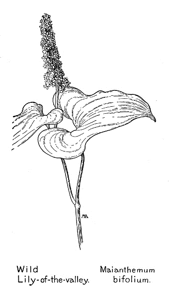This is a very attractive, woodland plant, from four to fourteen inches tall, with handsome, glossy, rich green leaves, and a rather stout stem, bearing a pretty cluster, two or three inches long, of many, small, waxy-white flowers, with four divisions. They have four stamens, with thread-like filaments and small, yellowish anthers, the stigma has two lobes and the berry is red. This grows in rich soil in the mountains and is much handsomer than its eastern relation and strongly sweet-scented. The Latin name means "blooming in May."