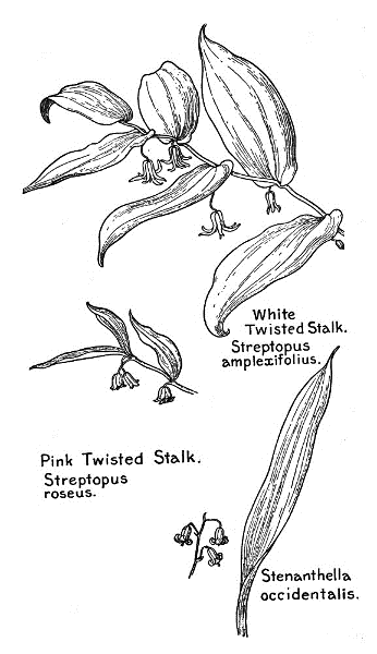 This is a fine plant, two or three feet tall, with a smooth, branching, bending stem and handsome leaves, thin in texture, with strongly marked veins and pale with whitish "bloom" on the under side. The greenish-white flowers are about half an inch long and hang on very slender, crooked pedicels, from under the leaves, and the oval berries are red and contain many seeds. This grows in moist soil, in cold mountain woods, up to an altitude of ten thousand feet and across the continent. The Greek name means "twisted stalk."