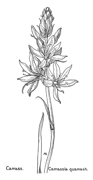 There are several kinds of Camassia, one eastern; herbs with onion-like bulbs, long, narrow leaves and thin, dry bracts. The flowers are blue of various shades, with six, separate, somewhat spreading divisions, each with a stamen on its base, the anthers swinging, the style threadlike, with a three-cleft tip; the capsule three-lobed, with several seeds in each compartment. Varieties of Camassia have long been cultivated in European gardens. The name is derived from Quamash, the Indian name for these plants.