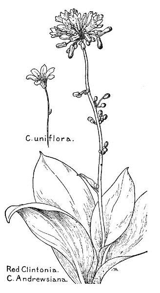 There are six kinds of Clintonia, of North America and Asia; with creeping rootstocks and a few, broad root-leaves; flowers without bracts, their divisions separate, equal or nearly so, each with a stamen at its base; style with two or three, inconspicuous lobes; fruit a berry. These plants were named in honor of De Witt Clinton, Governor of New York, a naturalist, interested in botany, so Thoreau need not have been so annoyed at their having been given this name.