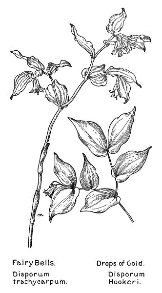 Fairy Bells are graceful plants, growing in rich, moist, mountain woods, with smoothish, or slightly hairy, branching stems, leafy above and with scaly bracts below, springing from slender root-stocks; leaves netted-veined, alternate, without leaf-stalks, smooth and thin in texture and often clasping the stem; rather small, bell-shaped flowers, hanging from under the leaves, with six stamens and a slender style, with one or three stigmas; the fruit a yellow or red berry. Disporum is from the Greek meaning "double-seed," as in some kinds there are two seeds in each cell of the ovary.