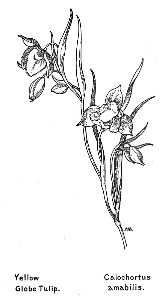 Perhaps the most characteristic western flowers are the members of the genus Calochortus. They grow freely all through the West, as far north as British America, and down into Mexico, but they never get east of Nebraska, so these gay and graceful flowers may be considered the peculiar property of the West. Calochortus means "beautiful grass" and the leaves are usually grasslike, the stems slender and the flowers bright in color, decorative and interesting in form. They have three sepals, often greenish, and three large, colored petals, with a honey-gland, usually covered with hairs, at the base of each. They are allied to true Tulips, so the popular name is suitable, and they fall into three groups: Globe Tulips, with nodding, globular flowers, and nodding capsules; Star Tulips, with erect, star-like flowers and nodding capsules; and Mariposa Tulips, with large, somewhat cup-shaped flowers and erect capsules. Mariposa means "butterfly" in Spanish and is appropriate, for the brilliant hairy spots on the petals are wonderfully like the markings of a butterfly's wing and the airy blossoms seem to have but just alighted on the tips of their slender stalks. They usually grow on dry open hillsides and their leaves have often withered away before the flowers bloom. The various forms run into each other, so that it is impossible to determine all the different species. They have solid bulbs, some of which are edible, considered a delicacy by the Indians and called Noonas.