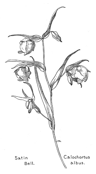 Beautiful and popular flowers, with a great deal of individuality and quite Japanese in the decorative arrangement of the graceful stems and glossy, rich green foliage. The narrow root-leaf is over a foot long and spreads on the ground and other smaller leaves are disposed along the bending stem, which is from one to two feet tall and hung with pretty light-green buds and beautiful drooping blossoms, over an inch long, pearly white, sometimes tinged with lilac, with a satiny sheen and delicate yet crisp in texture. The papery sepals are greenish-white and the petals are sometimes tinged with purple at the base and are prettily fringed with hairs along the edges and often cross their tips in a very engaging way. They are covered inside with long, silky, white or yellow hairs and the glands are crescent-shaped, with close, short, sticky, white or yellow hairs, and form pale-green humps on the outside of the petals; the anthers are cream-color and the pistil whitish. The capsule is one or two inches long, with a short beak and brown seeds. These plants grow on shady banks in the Coast Ranges and have several pretty common names, such as Lantern of the Fairies and Alabaster Tulip, as well as the misleading name Hairbell, which causes this flower to be confused with the Harebell or Campanula.