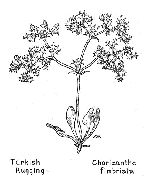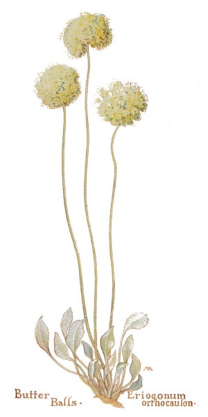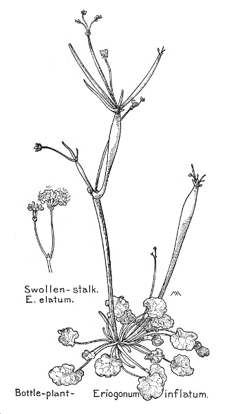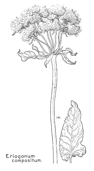 There are many kinds of Eriogonum, herbs or shrubs, natives of America, mostly western, growing in dry places, very numerous and difficult to distinguish. The leaves, without sheaths or stipules, are often covered with white down and usually grow in a spreading cluster at the base of the stem. The numerous small flowers, on very slender little pedicels, have six sepals, thin in texture and usually colored, and form clusters of various shapes, which emerge from more or less bell-shaped or top-shaped involucres, with six teeth. There are nine stamens, with threadlike filaments, often hairy, and a three-parted style with round-top stigmas. The name is from the Greek meaning "wooly knees," in allusion to the wooly joints of the stem.