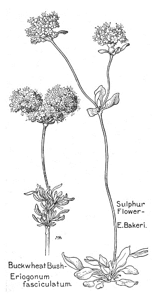 This plant is quite pretty and conspicuous, as the flowers are bright in color and a peculiar shade of sulphur yellow. The stem is downy and often reddish, about a foot tall, with two or three branches at the top, each bearing a cluster of numerous small sweet-scented flowers with pretty stamens. The gray-green leaves grow mostly in a rosette on the ground and are covered with close white down on the under side. Their soft tints tone in well with the bright color of the flowers and the pale sandy soil in which they grow. E. flàvum is similar and widely distributed. E. incànum is the same color but much smaller, often tinged with red, the gray leaves forming a dense velvety mat, and it grows at high altitudes, in sandy spots on rocks, and is found around the Yosemite Valley. The alpine form is very small. There are several other kinds of Sulphur Flower.