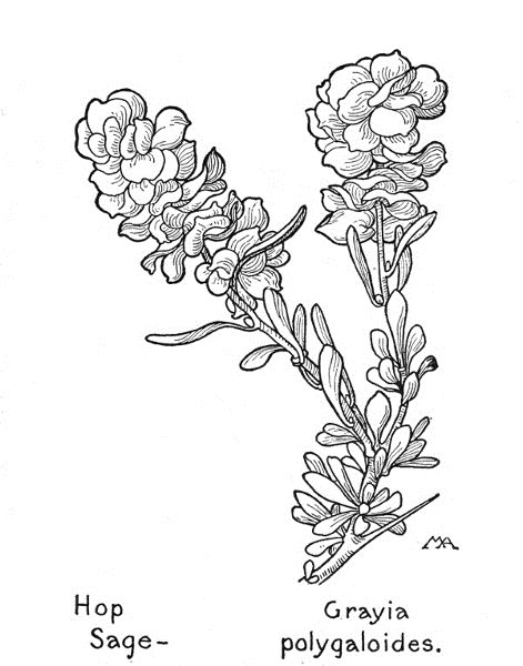 An odd and beautiful desert shrub, about three feet high, very dense in form, with interlacing, angular, gray branches, spiny and crowded with small, alternate, toothless leaves, pale-green and thickish, but not stiff. The flowers are small and inconspicuous, but the pistillate ones are enveloped in conspicuous bracts, which enlarge and become papery in fruit, something like those of Docks, and often change from yellowish-green to all sorts of beautiful, bright, warm tints of pink, or to magenta, and the branches become loaded with beautifully shaded bunches of these curious seed-vessels, giving a strange, crowded look to the shrub, which in favorable situations, such as the Mohave Desert, makes splendid masses of color, especially when contrasted with the pale gray of Sage-brush.