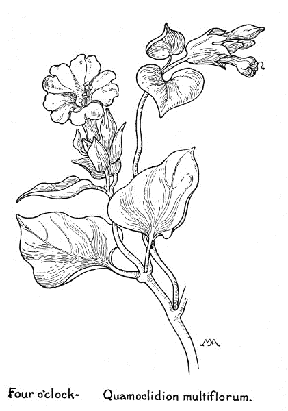 The leaves of this low, stout, and spreading perennial are an inch or two long, light bluish-green, somewhat heart-shaped, rather rough and coarse, and the stems are often hairy and sticky. The foliage contrasts strikingly in color with the gaudy pink or magenta flowers, an inch across and slightly sweet-scented, the shape of Morning-glories and resembling them, as they have the same stripes of deeper color. The long stamens droop to one side, the pistil is long and purple and the bell-shaped involucre contains about six flowers. These plants are conspicuous and quite handsome. They grow on the plateau in the Grand Canyon.