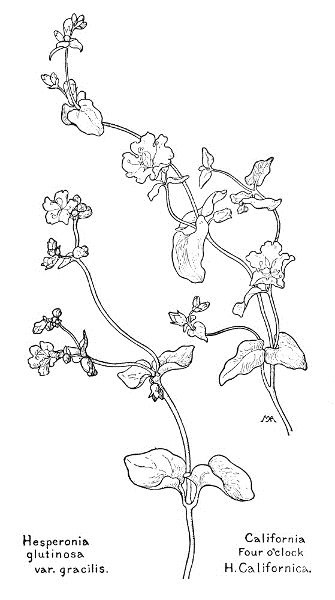 This has a straggling, hairy, sticky stem, over a foot long, and thickish, dull-green leaves, hairy and sticky. The flowers are about half an inch long, white or tinged with pink, and are rather delicate and pretty, though the plant is not especially attractive. It blooms at night, the flowers gradually closing with the morning sun. This variety is common in the southern part of the state, in mountain canyons, and Hesperonia glutinosa is common in the north.