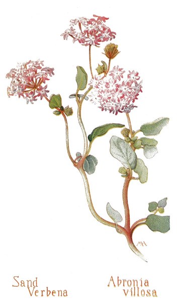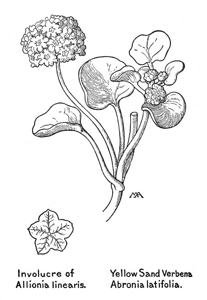 The coloring of this plant, one of the prettiest of its kind, is striking and unusual, and makes it very conspicuous, growing in the sand near the sea or in the desert. The thickish leaves are light bluish-green and the thick stem, which straggles rather awkwardly over the ground, is a peculiar shade of pink and sticky and hairy, as are also the involucres. The small delicate flowers are an odd tint of pinkish-lilac, light but vivid, in striking contrast to the coloring of stems and foliage, and form very pretty clusters, with an involucre of five to fifteen papery bracts. They are very fragrant and look much like garden Verbenas, so the name is not so unhappy as some. A. umbellàta has slender stems and almost smooth leaves, sometimes with wavy margins, about an inch long, narrowed at base to a slender leaf-stalk, and deep-pink flowers. It is common all along the California coast and blooms in the summer and autumn. A. marítima is found from Santa Barbara to San Diego and is a very stout, coarse, sticky plant, with small, deep-magenta flowers.