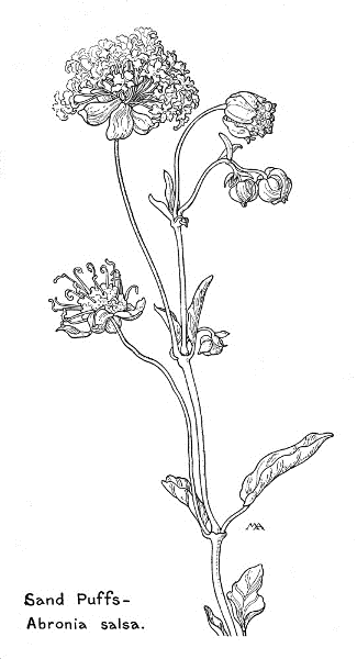 There are several kinds of Abronia, all American, with branching, usually sticky-hairy stems, thick, toothless leaves, with leaf-stalks, in pairs and one of each pair somewhat larger than the other. The flowers are more or less salver-form, with five lobes, a threadlike style, and from three to five, unequal stamens, on the tube of the perianth and not protruding from it. They are numerous and in clusters, with involucres, on long flower-stalks, from the angles of the leaves. The fruit is winged. The name is from the Greek meaning graceful, but most of these plants are rather awkward in their manner of growth.