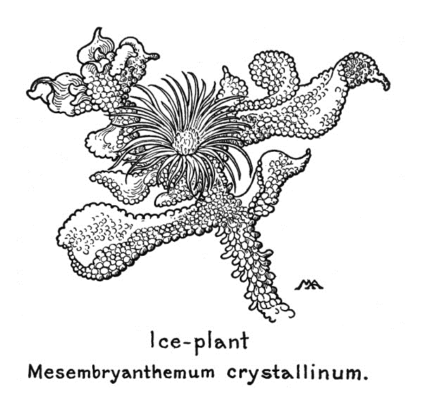 One of the queerest looking plants that it is possible to imagine, the stout stems and large flat leaves thickly encrusted with millions of small translucent beads, resembling glass or ice and giving a glistening effect to the whole plant. They cluster especially thickly along the wavy margins and under sides of the leaves, and on the calyxes, and feel quite hard to the touch, but when they are crushed underfoot they exude a watery juice, which is said to be alkaline and injurious to shoe-leather. The stems and leaves are light bright-green, the tips and margins tinged with bright pinkish-red, especially on dry mesas, where this plant sometimes covers the ground for long distances with flat rosettes, forming a thick, red carpet, beautiful in color. In shadier, damper places, such as the crevices in the sea-cliffs at La Jolla, it becomes quite a large, tall plant, scarcely tinged with red and very glistening. The flowers are about an inch across, with a greenish center, surrounded by numerous, small, yellowish anthers and a single row of many, white or flesh-colored petals, suggesting the tentacles of a sea-anemone. In fact the whole plant is curiously suggestive of some low form of animal life. It is very troublesome to farmers in the south near the sea, and also flourishes in the Mohave Desert, in France and the Canary Islands.