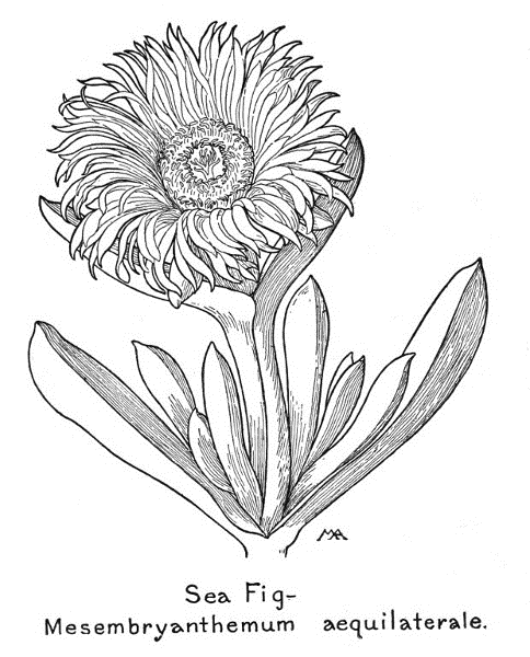 A very strange and conspicuous plant, often clothing sandy slopes with a curious mantel of trailing, fleshy stems and foliage thickly sprinkled with thousands of gaudy flowers. The stems are stout and flattish, several feet long; the leaves three-sided, with flat faces, tipped with a small reddish point; the calyx-lobes three-sided like the leaves. The stems, leaves, and the calyx-lobes are all pale bluish-green with a "bloom" and exceedingly succulent, the watery juice running out in large drops when the plant is broken. The twigs seem to be fitted into a sort of socket, from which they come out very easily, so that the plant comes apart almost at a touch. The fragrant flowers are two or three inches across, bright but crude in color, the numerous, purplish-pink petals resembling the rays of a composite and encircling a fuzzy ring of innumerable stamens, with white, threadlike filaments and small, straw-colored anthers, around a dark-green center, composed of the top of the calyx and the six to ten styles of the ovary. This accommodating plant is very useful and ornamental in hot, sandy places, where not much else will grow, and may be seen hanging its long stems over the sea-cliffs all along the coast, from Patagonia to Marin County in California. It also grows in Africa and is extensively cultivated. The fruit is edible, with pulp and tiny seeds something like a fig.