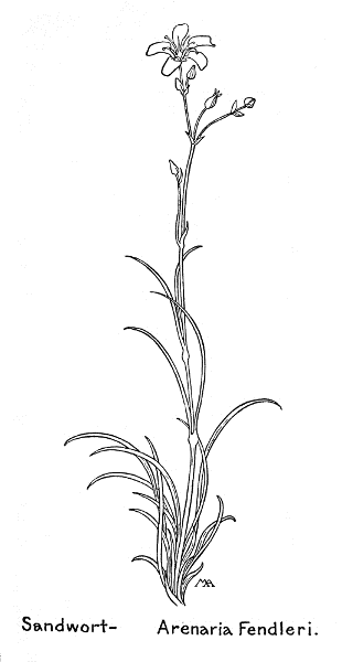There are numerous kinds of Arenaria, widely distributed, difficult to distinguish, with small, white flowers with five petals, usually not notched, ten stamens and usually three styles; leaves usually long and narrow, often stiff and growing in tufts; capsule roundish, splitting into usually three valves, each with two parts. These plants often grow in dry, sandy places, some at very high altitudes, some by the sea, hence the Latin name meaning "sandy," and the common one, Sandwort.