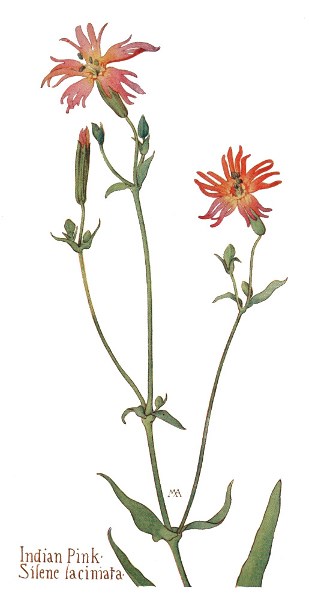 This has handsome conspicuous flowers, clear vermilion or pinkish-scarlet in color, about an inch and a half across, with the five petals prettily slashed at the ends into four long divisions. Each petal has two little crests, which form a pretty "crown" in the throat of the corolla. The roughish, slender stems, from one to over two feet high, have several branches, the flowers growing two or three at the ends. The leaves are long, narrow, and rather rough and the whole plant is hairy and sticky. This is common around Pasadena and other places in southern California and is beautiful on Point Loma, where the brilliant flowers gleam among the underbrush like bits of flame. S. laciniàta var. Gréggii is common in Arizona and New Mexico.