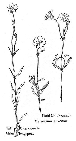There are many kinds of Alsine, widely distributed, low herbs, liking moist ground and shady places, with small, starry white flowers; with four or five sepals; four or five petals, deeply two-lobed or none; three to ten stamens and three to five styles; capsule roundish or oblong, rather shorter than that of Cerastium, splitting to below the middle, with twice as many valves as there are styles and many seeds. Many of these plants are weeds. They are often called Stitchwort. The Greek name means "grove," the home of some kinds.