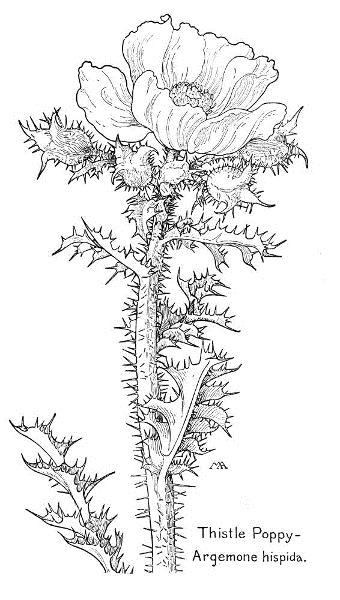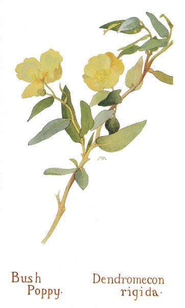 This is not a true Poppy, but the flowers are sufficiently like to be quite surprising when we find them growing on what appears to be a small willow tree! It is a handsome and decorative shrub, both in form and color, two to eight feet high, with pale woody stems, the main stem with shreddy bark, and light bluish-green foliage, the leaves something like those of willow, but quite stiff and leathery, with a little pointed tip, the short leaf-stalks twisted so as to bring the leaf into a vertical position. Sprinkled all over the bush are numbers of beautiful, clear golden-yellow flowers, one to three inches across, with orange-colored anthers and a pale-yellow pistil. This grows on dry, sunny hillsides, at middle altitudes, and is common in southern California, but is particularly fine near Santa Barbara. The flowers have a slight smell like cucumber and may be found in bloom at all seasons of the year. The ribbed seed-pod is long and narrow.