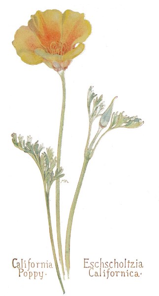 Probably the most celebrated western flower and deservedly popular. It varies a great deal in general form and coloring, but is usually a fine plant, over a foot tall, with stems and leaves a beautiful shade of light bluish-green, and the flowers two or three inches across, usually bright-yellow, shading to orange at the base, but sometimes almost cream-color. They open in sunlight and when blooming in quantities are a beautiful sight, covering the hillsides with a cloth of gold. In southern Arizona a similar kind often borders the dry beds of streams with bright color, with much the same value in the landscape as the Marsh Marigolds along New England streams. It is the State flower of California and has many poetic Spanish names, such as Torosa, Amapola, and Dormidera, besides Copa de Oro, meaning "Cup of gold."