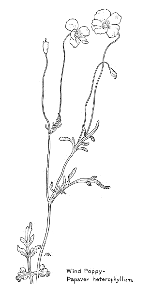 There are many kinds of Papaver; with milky juice, leaves lobed or cut, nodding flower buds, showy regular flowers, with two or three sepals and four to six petals. The stigmas are united to form a disk with rays and the fruit is a round or oblong capsule, opening near the top. Both the Latin and common name, Poppy, are ancient. Opium is made from P. somníferum of the Mediterranean.
