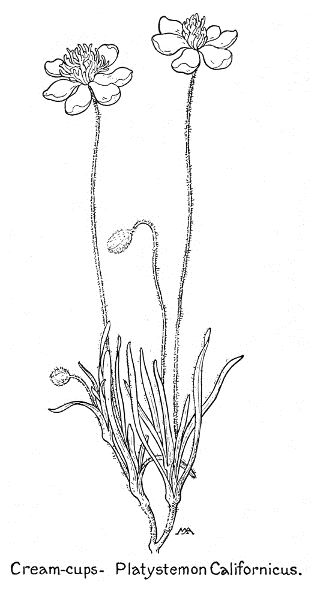There is only one kind of Platystemon, with stem leaves opposite or in whorls; sepals three, soon falling; petals six; stamens many, with broad, flat filaments. The numerous pistils are at first partly united, forming a compound ovary; when ripe they separate into knotted pods, which break apart between the seeds. The name means "broad stamens."