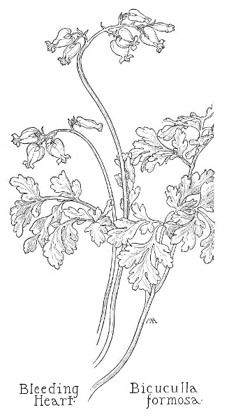 There are several kinds of Bicuculla, natives of North America and Asia; perennials, with beautiful foliage and decorative flowers, of the curious and intricate shape we are familiar with in old-fashioned gardens. The pedicels have two bracts; the corolla is heart-shaped at base; the outer pair of petals are oblong and concave, with spreading tips and spurred or pouched at base, the inner pair are narrow and clawed, with crests or wings on the back; the style is slender, with a two-lobed stigma, each lobe with two crests. The creeping rootstock is surrounded by a bulb-like cluster of fleshy grains. These plants are often called Dutchman's Breeches, from the shape of the flower, which, of course, also gives the pretty name Bleeding Heart. Bicuculla is from the Latin, meaning "double-hooded."