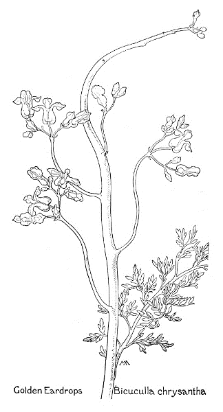 The general appearance of this handsome plant is striking and Japanese in effect, and the coloring of the feathery, pale-green foliage and the golden-yellow flowers is exceedingly odd and beautiful. The large, finely-cut leaves are sometimes a foot long, and resemble delicate ferns, and the smooth, stout, rather coarse flower-stems bear a few pretty flowers, which are a soft shade of yellow, about three-quarters of an inch long, the usual Bleeding Heart shape, but not drooping, and with a strong narcotic odor, much like that of poppies. This is sometimes as much as four feet high and grows in sunny places on dry ridges in the Coast Ranges, but is nowhere common.