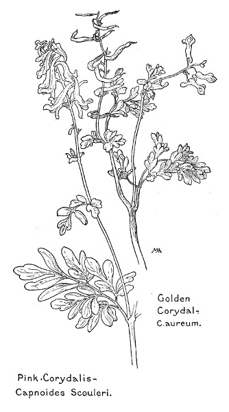 There are many kinds of Capnoides, natives of the north temperate zone and Africa. They have oddly-shaped flowers, something like Bleeding Heart, but with only one spur, at the back on the upper side, instead of two. The name is from the Greek, meaning "smokelike," in allusion to the odor of some kinds.