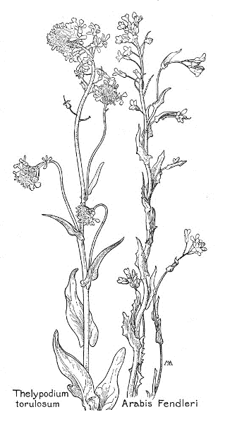 There are a good many kinds of Thelypodium, natives of North America, all western or southwestern; mostly smooth plants, the leaves usually with leaf-stalks, the flowers in clusters; stamens long, conspicuous, with very narrow, arrow-shaped anthers; pods long, cylindrical or four-sided, often twisted, sometimes on a slender stalk; seeds oblong, flattish, in one row in each cell.