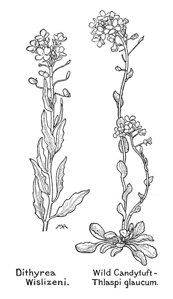 There are a good many kinds of Thlaspi, of temperate and arctic regions: smooth low plants, mostly mountain; root-leaves forming a rosette; stem-leaves more or less arrow-shaped and clasping; flowers rather small, white or purplish; sepals blunt; style slender, sometimes none, with a small stigma; pod flat, roundish, wedge-shaped, or heart-shaped, with crests or wings.