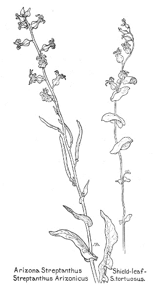 There are many kinds of Streptanthus, difficult to distinguish, smooth plants, often with a "bloom"; stems branching; leaves often clasping at base, the lower ones usually more toothed or lobed than the upper. The flowers are very peculiar in shape, not like most Mustards, but suggesting the shape of a Bleeding Heart flower; the sepals usually colored like the petals, two or all of them bulging at base, so that the calyx is broad below and contracted above; the corolla regular or irregular, the petals purple or white, with claws and narrow, wavy or crisp borders; the stamens four long and two short, or in three unequal pairs, the longest pair often united below; the pods long, narrow, flattish or cylindrical, on a broad receptacle; the seeds flat and more or less winged. These plants are called Jewel-flower, but the name does not seem particularly appropriate.
