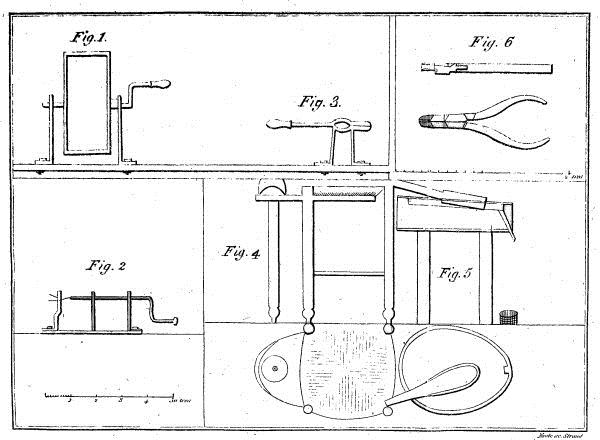 • Fig. 6. A front and side view of pointed pincers, used for twisting the wire employed to keep on the corks, and for cutting off the superfluous ends of the wire. I make use of flat pincers and scissars for this operation.