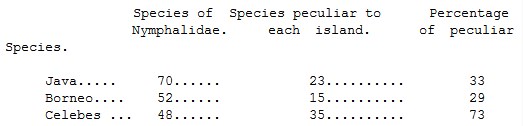For the purpose of insuring accuracy in comparisons with other islands, I shall confine myself to those groups which are best known, or which I have myself carefully studied. Beginning with the Papilionidae or Swallow-tailed butterflies, Celebes possesses 24 species, of which the large number of 18 are not found in any other island. If we compare this with Borneo, which out of 29 species has only two not found elsewhere, the difference is as striking as anything can be. In the family of the Pieridae, or white butterflies, the difference is not quite so great, owing perhaps to the more wandering habits of the group; but it is still very remarkable. Out of 30 species inhabiting Celebes, 19 are peculiar, while Java (from which more species are known than from Sumatra or Borneo), out of 37 species, has only 13 peculiar. The Danaidae are large, but weak-flying butterflies, which frequent forests and gardens, and are plainly but often very richly coloured. Of these my own collection contains 16 species from Celebes and 15 from Borneo; but whereas no less than 14 are confined to the former island, only two are peculiar to the latter. The Nymphalidae are a very extensive group, of generally strong-winged and very bright-coloured butterflies, very abundant in the tropics, and represented in our own country by our Fritillaries, our Vanessas, and our Purple-emperor. Some months ago I drew up a list of the Eastern species of this group, including all the new ones discovered by myself, and arrived at the following comparative results:—