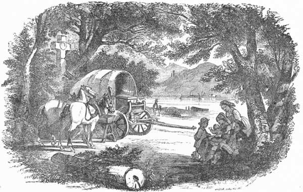 Just at this time, Rollo's attention was attracted to what seemed to be an encampment on the roadside at a little distance before them. It was a family of emigrants that were going down the river, and had stopped to rest. The horses had been unharnessed, and were eating, and the wagon was surrounded with a family consisting of men, women, and children, who were sitting on the bank taking their suppers. Rollo wished very much that he understood German, so as to go and talk with them. But he did not, and so he contented himself with wishing them guten abend, which means good evening, as he went by.