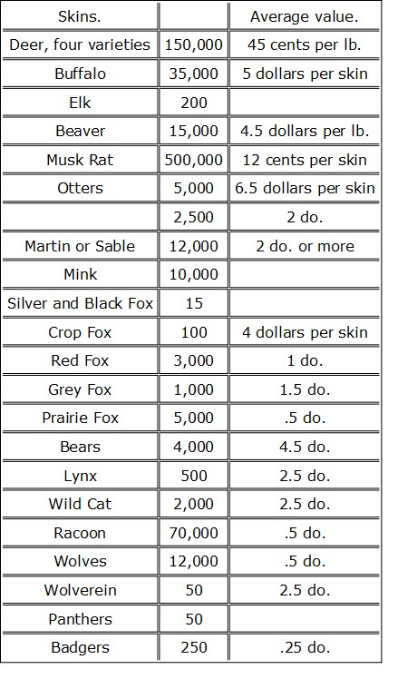 besides skunks, ground-hogs, hares, and many others. These are priced at the lowest: in proportion as the skins are finer, so do they yield higher profit. The two companies may be said to receive, between them, skins yearly to the amount of from two to three millions of dollars.