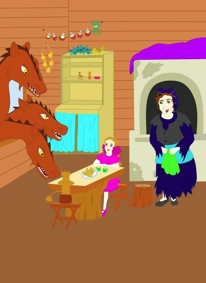 Смотришь, разговаривать научился – произнесла Баба Яга. Внезапно в окне появилась огромная голова, за ней еще одна, и еще одна растолкав первые две, пыталась влезть в окно. Маша и Пушистик удивлённо хлопали глазами.