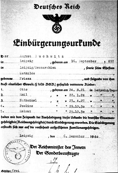 6 октября нам пришлось покинуть нашу родину. Как будто провидение Бога привело нас, лейпцигцев, 25 октября в город Лейпциг. 2500 наших земляков получили временное жильё в разных учреждениях. Мы жили в правительстве, на улице Дискауэр, 93. По представленному на рис. 5 документу видно, что я родился в 1892 г. в Бессарабском Лейпциге, а получил немецкое гражданство 6 декабря 1940 г. в городе Лейпциге.