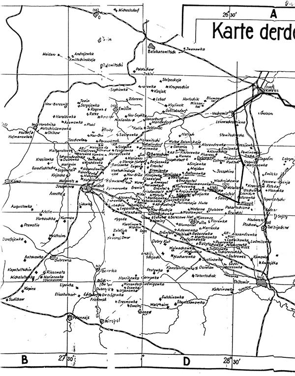 Здесь 3 железнодорожные линии: Ковель-Киев, Ельск-Звягель и добавленная в прошлом году линия Житомир-Искорость. Этот узел являлся хорошей предпосылкой для восстановления и развития исторического места. В настоящее время это поселение с единственным широким шоссе не намного больше нашего волостного города Кутузово (Горошки)[50]. С обеих сторон дороги между большими магазинами, лавками, пивными (кабаками) стояли небольшие частные дома, окрашенные в разные цвета, которые приветливо светились навстречу путникам. На зелёной деревенской площади стоял двухэтажный дом волостной управы и небольшой, но красивый, православный храм. Действительно, городок был чистым и выглядел приятно и мирно.