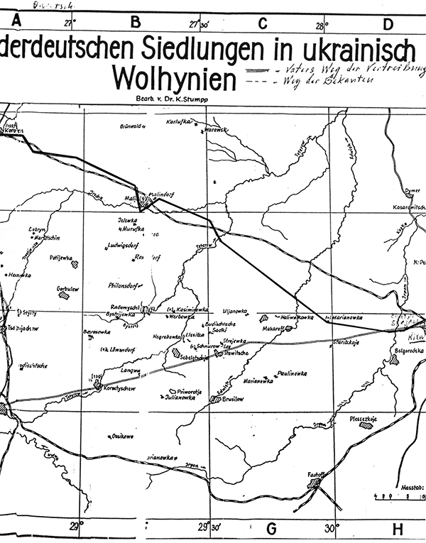 Не было никаких указаний о том, куда нам переселяться. Но все полагали, что это не может быть далеко. Разговор шёл о Курске, Туле, возможно Саратове или Пензе. В императорском указе говорилось о 150 вёрстах вглубь страны. Если бы расстояние было больше, то нас отправили бы поездом. Деревни немцев Волыни лежали рядом с железнодорожными линиями Звягель[44] -Коростень, Коростень-Киев и Звягель-Киев. Большинство колонистов считало, что с фронта идёт много пустых железнодорожных вагонов, которые могли бы нас вывезти.