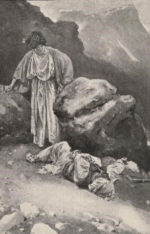 Presently he saw something white, huddled up behind a rock and, climbing up, he found that it was the dead body of an Afridi, who had fallen in the fight. Beside him lay his Lee-Metford rifle. This was indeed a find. In the scanty garments that he had alone dared to take, he would be known at once by anyone who happened to pass near him. He now set to work, and dressed himself in the dead warrior's garments; and took up his rifle and pouch of ammunition.