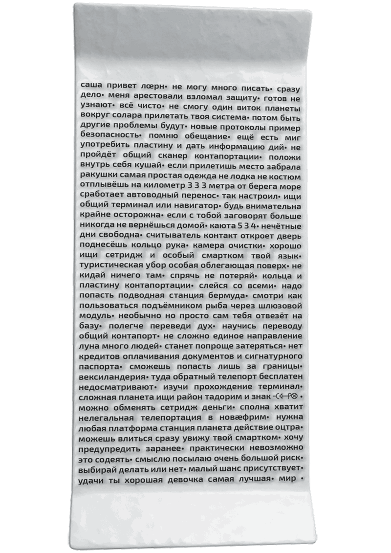 Пока везли плавательный костюм, Саша досконально перечитала каждую строчку письма и на всякий случай выучила наизусть. Проверив данные для нейронного запроса, девушка сохранила информацию на три мини-флешки и запаяла их в пластик с помощью 3D-принтера.