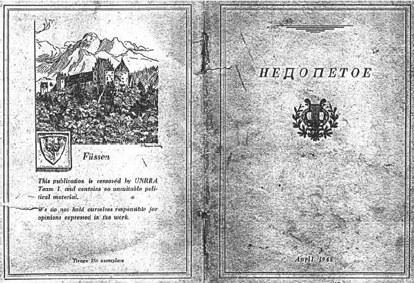 Одним из первых подобных изданий стал найденный нами в личном архиве В.В. Колосовича сборник «Недопетое: Песни юных русских изгнанников», изданный, как сказано на титуле, «группой молодежи в Русском лагере города Фюссен» в апреле 1946 тиражом в 250 экз. Представленные в книге стихотворения двух молодых людей Миши Орлова и Коли Тарасова наивны, несовершенны и подражательны. Интерес представляет тематика книги: «Родина и ее люди» и «Лирика». Ограничюсь одной цитатой – лирическим стихотворением Н. Тарасова о русской душе: