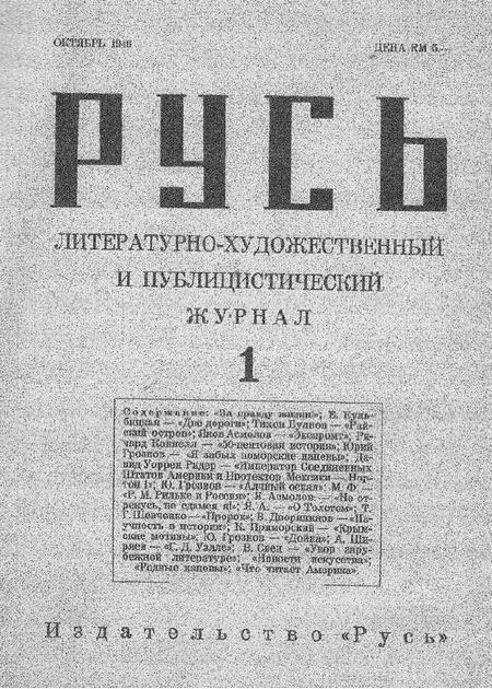 Назовем также изданный Георгием Широковым под псевдонимом Ю. Грознов единственный номер журнала «Русь»[13]. Уже первая (редакционная) статья, открывающаяся обширной цитатой о Руси из «Мертвых душ» Гоголя, утверждала, что «политика бессильна перед подлинным искусством, перед правдой жизни, которой должно служить искусство». Небольшой редакционный коллектив стремился познакомить читателя и с творчеством Т. Шевченко, и с биографией Г. Уэллса, и с мнениями Т. Манна о Пушкине, Р.М. Рильке – о России. В краткой заметке говорилось о влиянии Л. Толстого на творчество советских писателей. Собственно поэзия была представлена четырьмя именами: Е. Кульбицкая, Ю. Грознов, Я. Асмолов и К. Приморский