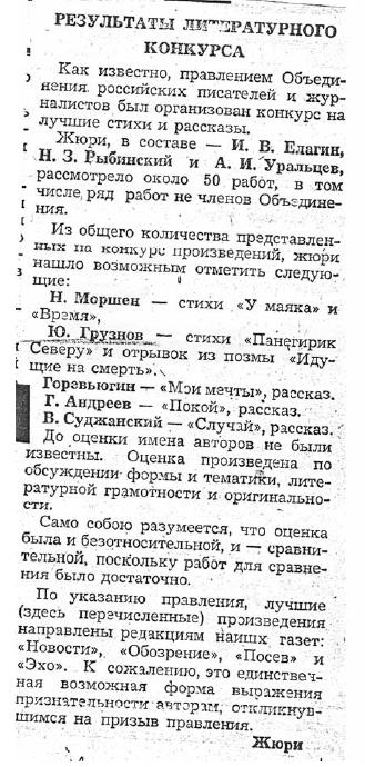 О, Север!Кто красу позналТвоиховьюженных преданий,И солнца меркнущий опалНа бирюзовой неба длани,И гордость сизую в очахСынов полуночной природы, —Тот, жизнь никчемную влача,КТебепридет на вечный отдых.Так я, в немилых мне краяхВнимая южных песен трелям,Мечтаю о метельных снахНа ледянойТвоейпостели.Подлинным поэтическим событием стал выход в Мюнхене сборника «Стихи»[16], куда вошли произведения О. Анстей, С. Бонгарта (им же создана обложка книги: зимний пейзаж Мюнхена), Влад. Гальского, И. Елагина, С. Зубарева, Н. Касима, Н. Кудашева, А. Савиновой, А. Шишковой[17]. Сборник был замечен русской диаспорой, хотя и получил противоположные отзывы. Если рецензент парижской газеты «Русская мысль» И. Тхоржевский в статье «Поэзия за проволокой»[18] дал самую высокую оценку сборнику, то критик «Огней» А. Черных обвинил авторов книги в «потрясающе-замогильном пессимизме». Завершая рецензию-разгром, А. Черных призывал: «Мы ценим и любим наших поэтов, но мы требуем от них гражданского мужества: перебороть ощущение кажущейся беспросветности и найти в себе силы не только верить, но и вести за собой»[19].