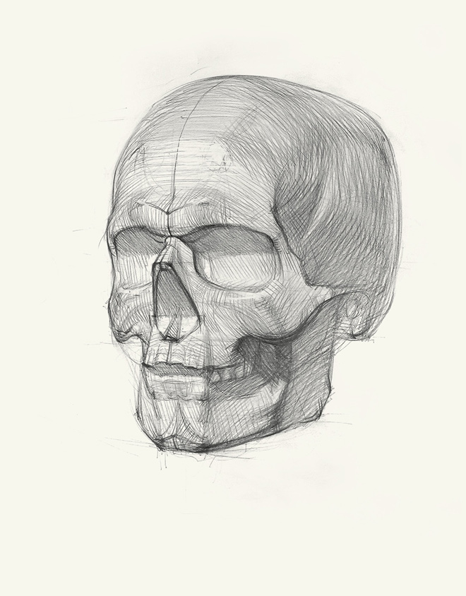 5. СВЕТ И ТЕНЬПятый этап – самый долгий в рисовании черепа. Основная сложность в том, чтобы чувствовать тон и правильно обозначать штриховкой разницу между плоскостями, не размыв при этом общую конструкцию.
