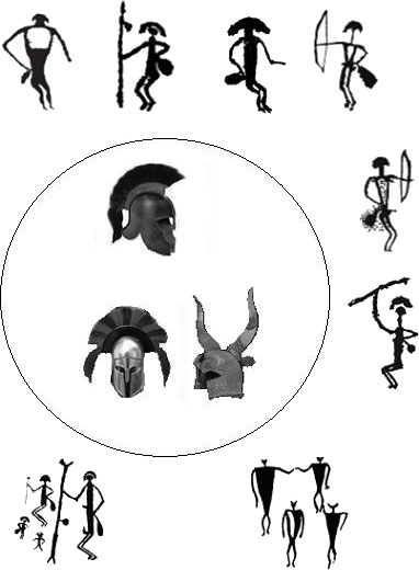 Рис. 12. Вариации грибовидных (рогатых) головных уборов Саяно-Алтая и Древней Греции (в центре).