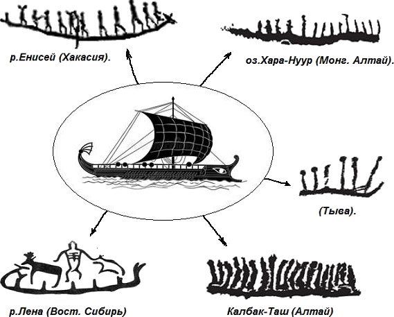 Рис. 13. Вариации лодок в виде водного дракона (с головой змеи и хвостом рыбы) с сибирскими «аргонавтами» на борту (на хребте арга). В центре – корабль «Арго».