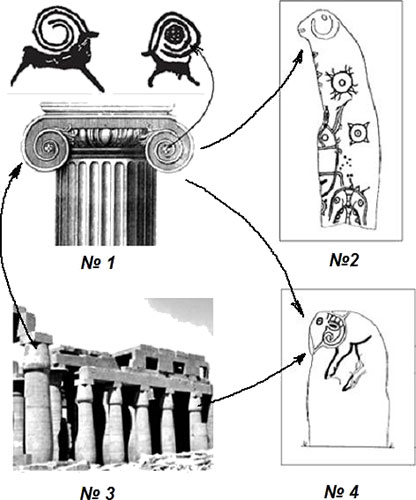 В изображениях капители (в виде закрученного рога барана) догреческих колонн угадывается религиозный синкретизм Гермеса (его фаллический символ – рога) с далекими прообразами в каменных изваяниях Хакасии (с головами барана). Бараньи рога (см. тюр. «мес», «мус» или сан. «мesa» – баран) несли ударную функцию фаллоса – некой ритуальной Силы «проникновения» и оплодотворения. Кстати, козлорогий Пан, сын Гермеса, так же имеет отношение к петроглифическим рисункам рогатых персонажей Сибири – первобытным жрецам пан/панг/бангос. Вероятно, «панты» (рога) из этой же серии.