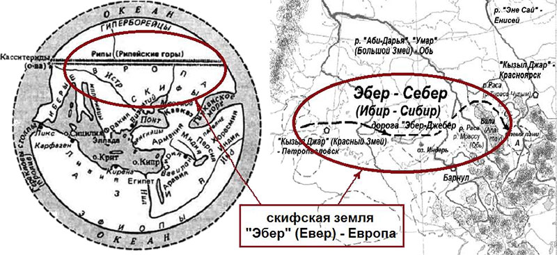 Карта Земли Гекатея (ок. 600 г. до н. э.) с указанием р. Истр (Дунай) в Европе, где проходила западная граница Скифии (слева). Справа – сибирская земля Эбер-Себер (Эбер – Джебер, Ибир-Сибир), упоминаемая в «Джагфар Тарихи» и персидским летописцем Рашид-ад-Дином.