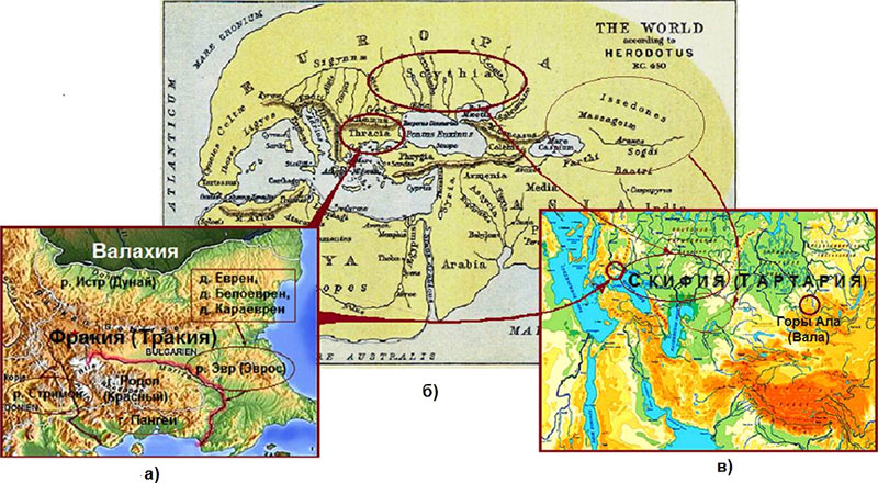 а) восточное царство пеласгов – Фракия и Валахия; б) карта Геродота (V в. до н. э.) с указаниями Фракии (Тракии), Скифии и некоторых сакских областей; в) Тартария – Внутрення часть Азиатского континента, фигурирующая на многих старых картах (кружком обозначены горы Ала или скифская Киммерия).